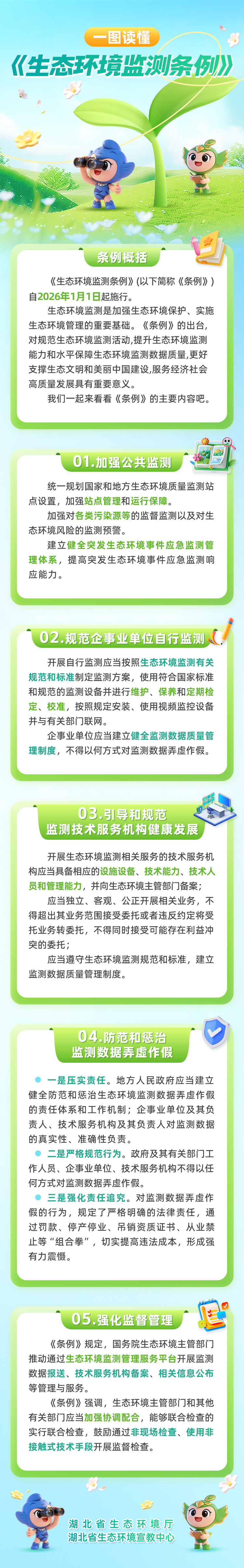 《生态环境监测条例》自2026年1月1日起施行。生态环境监测是加强生态环境保护、实施生态环境管理的重要基础。《条例》的出台,对规范生态环境监测活动,提升生态环境监测能力和水平保障生态环境监测数据质量,更好支撑生态文明和美丽中国建设,服务经济社会高质量发展具有重要意义。